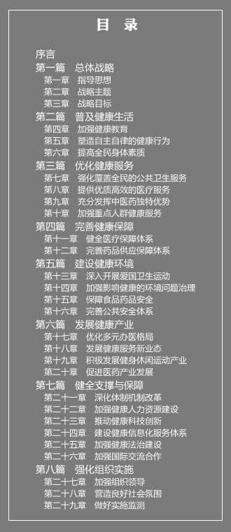 到2020年,建立覆盖城乡居民的中国特色基本医疗卫生制度,健康素养水平持续提高,健康服务体系完善高效,人人享有基本医疗卫生服务和基本体育健身服务,基本形成内涵丰富、结构合理的健康产业体系,主要健康指标居于中高收入国家前列。